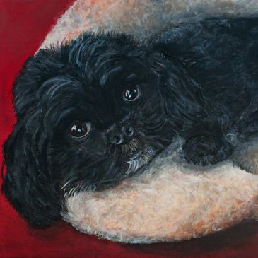 I hand-draw, then hand-paint with professional-grade acrylic paint on 1-1/2" thick archival quality, gallery-wrapped canvas. I work from provided photographs and talk extensively with my clients to learn about the pet's unique personality, quirks and behavior, and translate that playful gleam in her eye or his calm and quiet demeanor into my painting.
