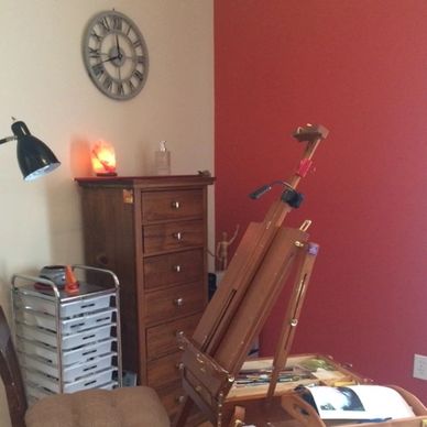 After more than 25 years in a marketing career in the corporate world, and the last eight in my own marketing consulting business, I picked up a paintbrush at a "wine and paint" party and resumed my love of painting with acrylics on canvas. My Dad, a talented and accomplished woodcarver and painter, now 92 years old, inspired me to continue, and then gave me his old wood easel, art supplies and a few vintage art instruction books.